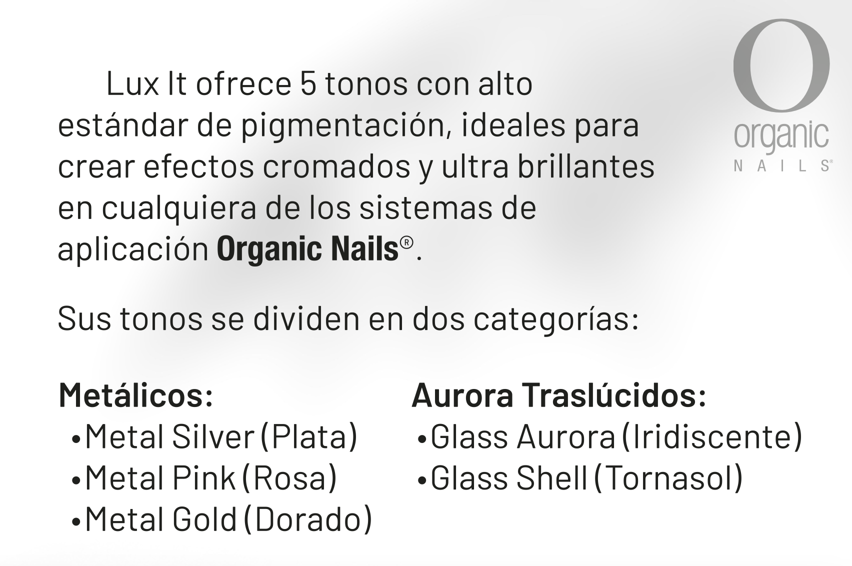 Pigmento Lux it Pigmento para efectos cromados y ultra brillantes $ 7.490 Lux It Glass Aurora 0.5gr Lux It Glass Shell 0.5gr Lux It Metal Gold 0.5g Lux It Metal Pink 0.5gr Lux It Metal Silver 0.5gr cantidad Agregar al carro Encargar